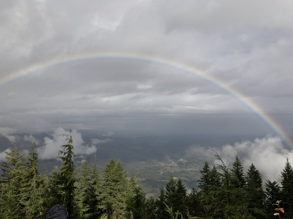 We did get out the past couple of weekends and venture around the area. Two weeks ago, we crossed the Hood Canal bridge and went over to the Olympic Peninsula where we followed Route 101 south from north of Leland to Shelton, and then back up Route 3 into Bremerton and back home. Of course, Bella came along for the ride too. We took one side trip, up Mt. Walker where we saw a nice rainbow.