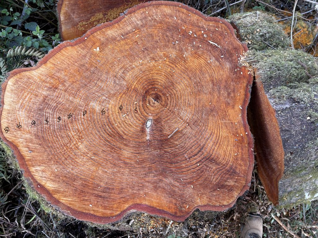 All the trees were pretty large, being at least two feet in diameter. I have included some pictures of the tree rings from one of the alders. I counted 50 rings.
